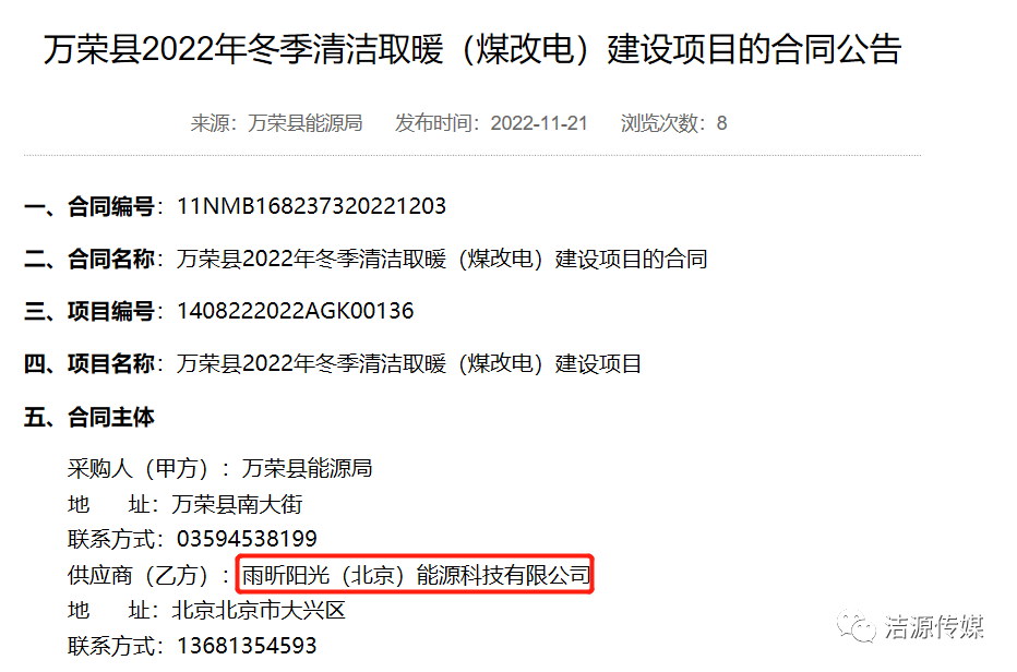 雨昕阳光中标万荣县2022年冬季清洁取暖(煤改电)建设项目