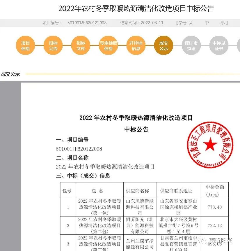2022年8月11日,皋兰县发布2022年农村冬季取暖热源清洁化改造项目中标公告,雨昕阳光中标第二标段太阳能+采暖项目,中标额722.12万元。助力国家碳中和、碳达峰早日实现,雨昕阳光继续贡献自己的一份力量。