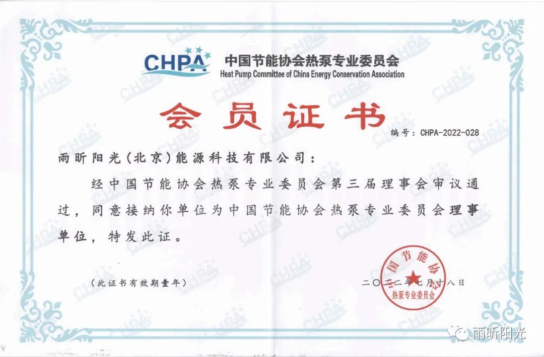 2022年7月18日,经中国节能协会热泵专业委员会第三届理事会审议通过,雨昕阳光(北京)能源科技有限公司再次成为中国节能协会热泵专业委员会理事单位,董事长孙培雨先生被聘为中国节能协会热泵专业委员会第三届理事会理事。