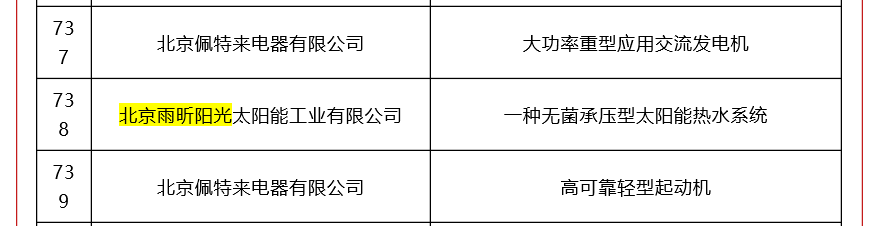 雨昕阳光无菌承压无动力太阳能热水系统入围第九批北京市新技术新产品(服务)名单