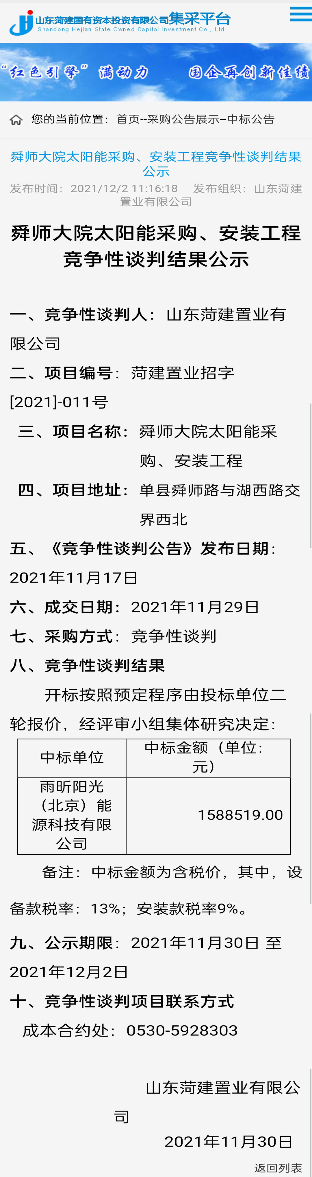 雨昕阳光中标单县舜师大院太阳能采购、安装工程