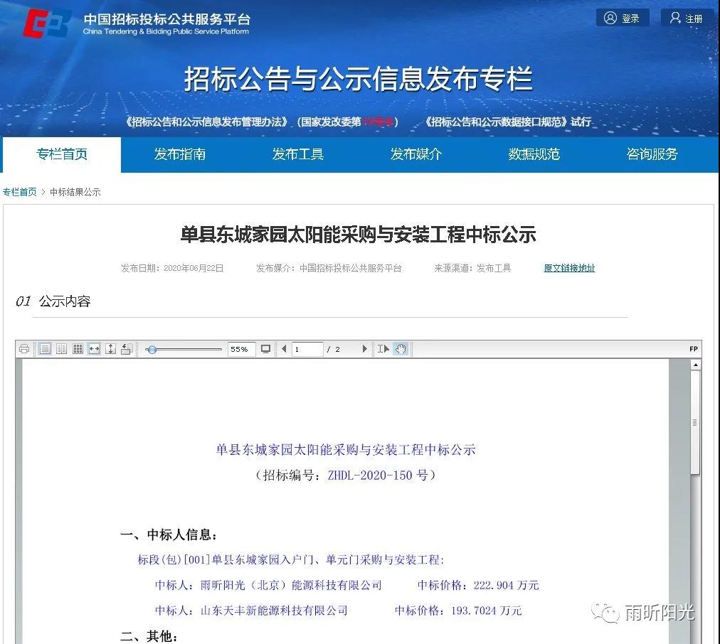 6月23日,雨昕阳光市场二部再传捷报,经过一轮又一轮的激烈竞争,雨昕阳光(北京)能源科技有限公司最终中标单县东城家园太阳能热水采购与安装工程。 该项目从首次接触到尘埃落定,在与众多强劲对手的激励竞争中,凭借诚恳认真的态度,贴心周到的服务,精准快速的响应,匠心独具的产品,以及丰富的设计施工经验,最终以绝对的优势中标。本次中标再次印证了雨昕阳光在二十年发展中积累的强大实力。