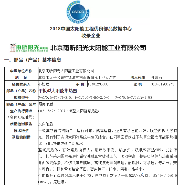 雨昕阳光公司平板型太阳能集热器等产品入选中国太阳能优良部品数据中心