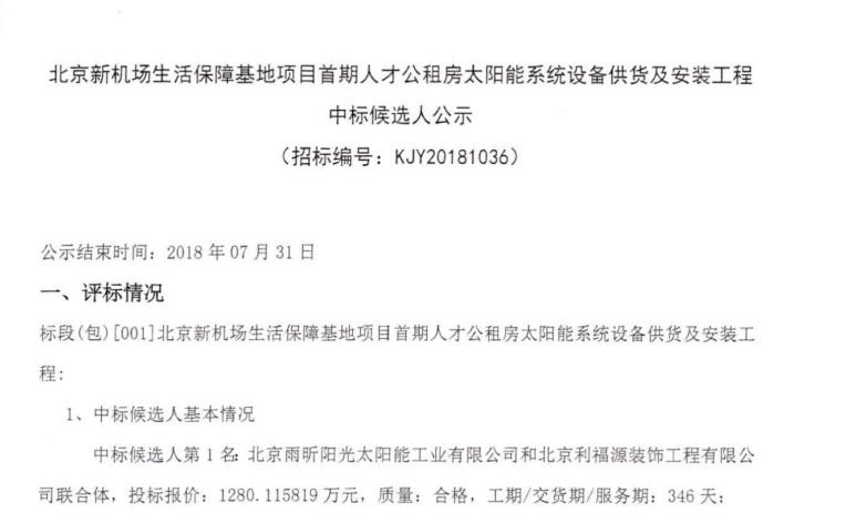 雨昕阳光中标北京新机场生活保障基地首期人才公租房项目太阳能工程
