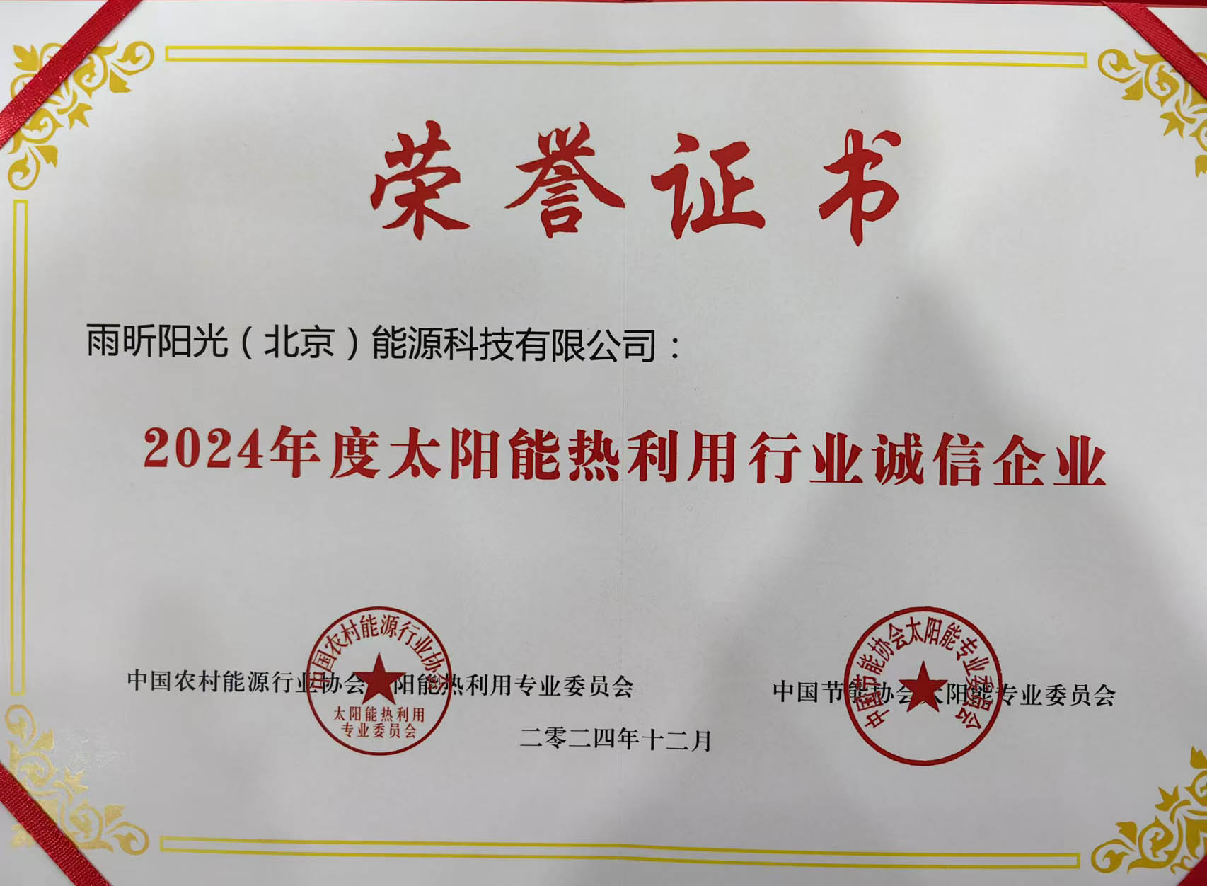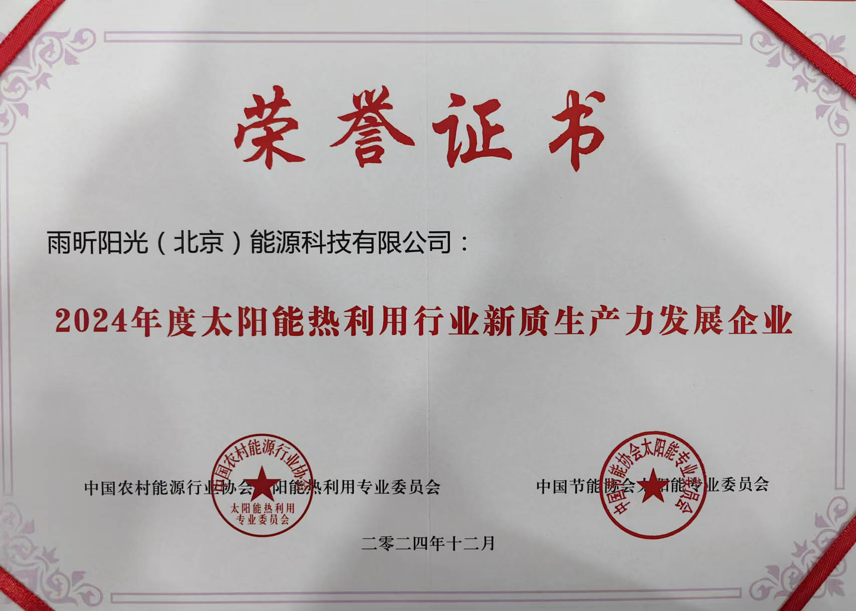 在本届年会上,雨昕阳光凭借二十多年以“为民众享有绿色节能的美好居住环境而服务”为使命,在太阳能热利用领域的诚信经营、坚持创新和技术驱动,,荣获 “2024年度太阳能热利用行业诚信企业”和“2024年度太阳能热利用行业新质生产力发展企业”两项大奖。